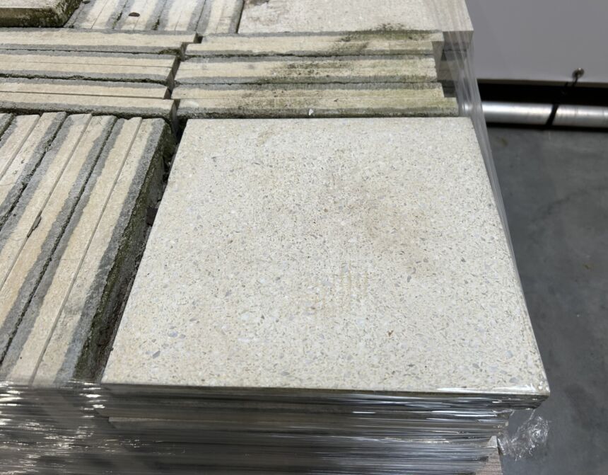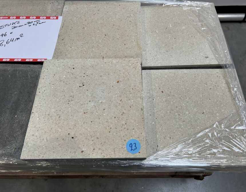 Lot betontegels granito's +/- 8m²Beige met bruine spikkel ; 30 x 30 x 2,5 96 stuks