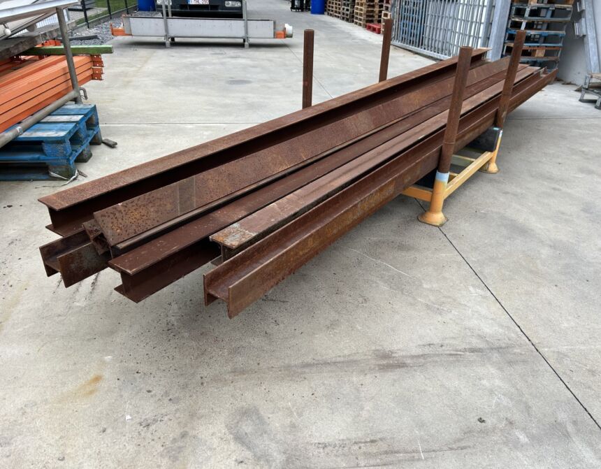 Lot poutrellen 12 x 12 cmafmetingen tussen 4,6 en 5 M; 0,5 cm dik 9 stuks (90 kg per stuk) container niet inbegrepen !