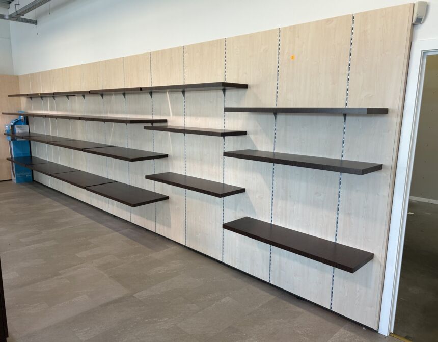 Volledige winkelwand (achteraan winkel)16M lang , 2,30M hoog (Panelen van 60 cm breed) banken 1,20M x 35 cm(18st) en 50 cm (12st) gemakk...