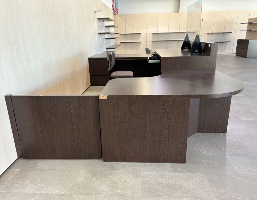 Bureel / Kassa Meubel4M breed x 2,40M diep x 73cm en 93cm en 1,11 M hoog Inclusief stoelen